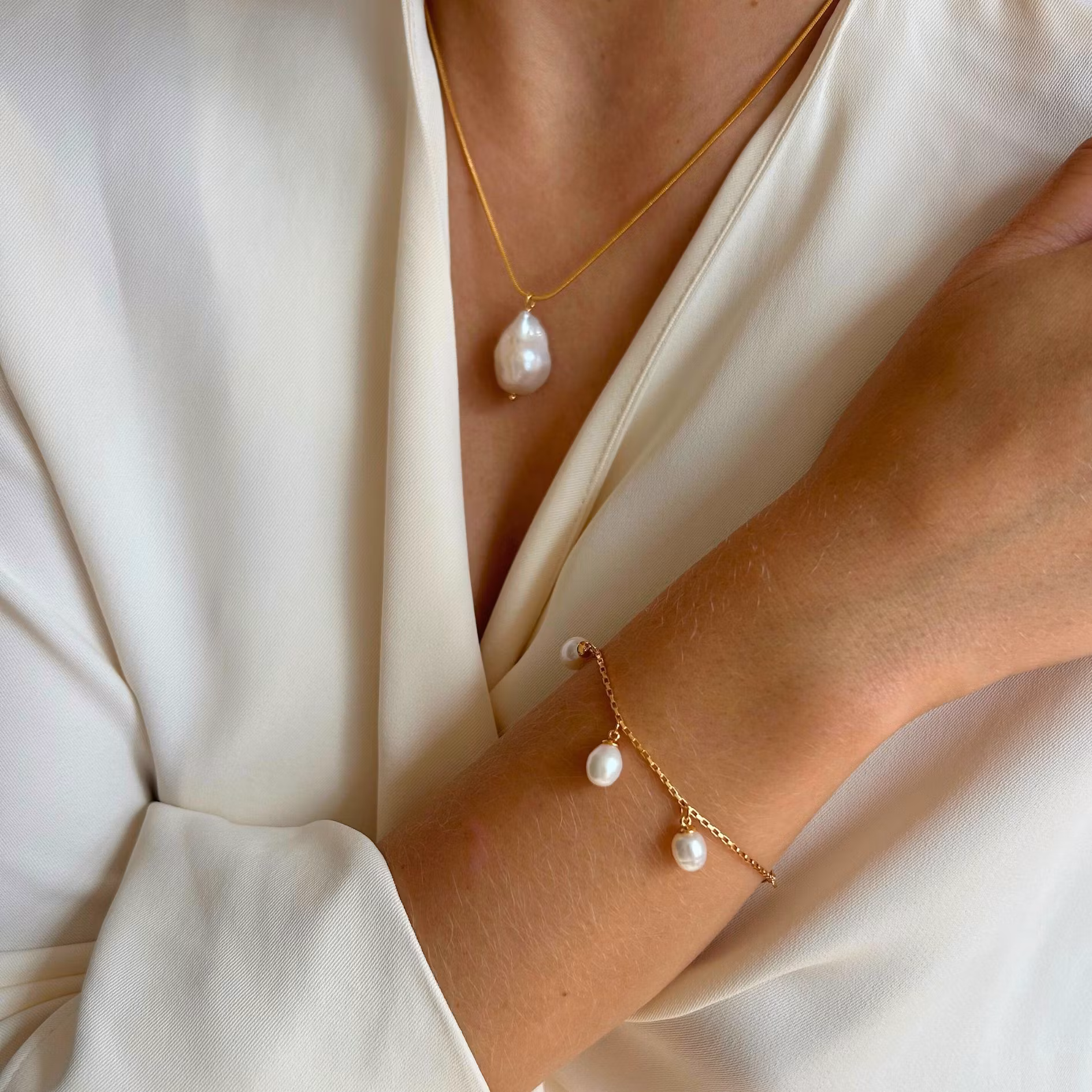 Naturlige ferskvandsperler, der følger dine bevægelser. Det enkle valg, når dagen begynder, og et armbånd der er med dig fra første stund.