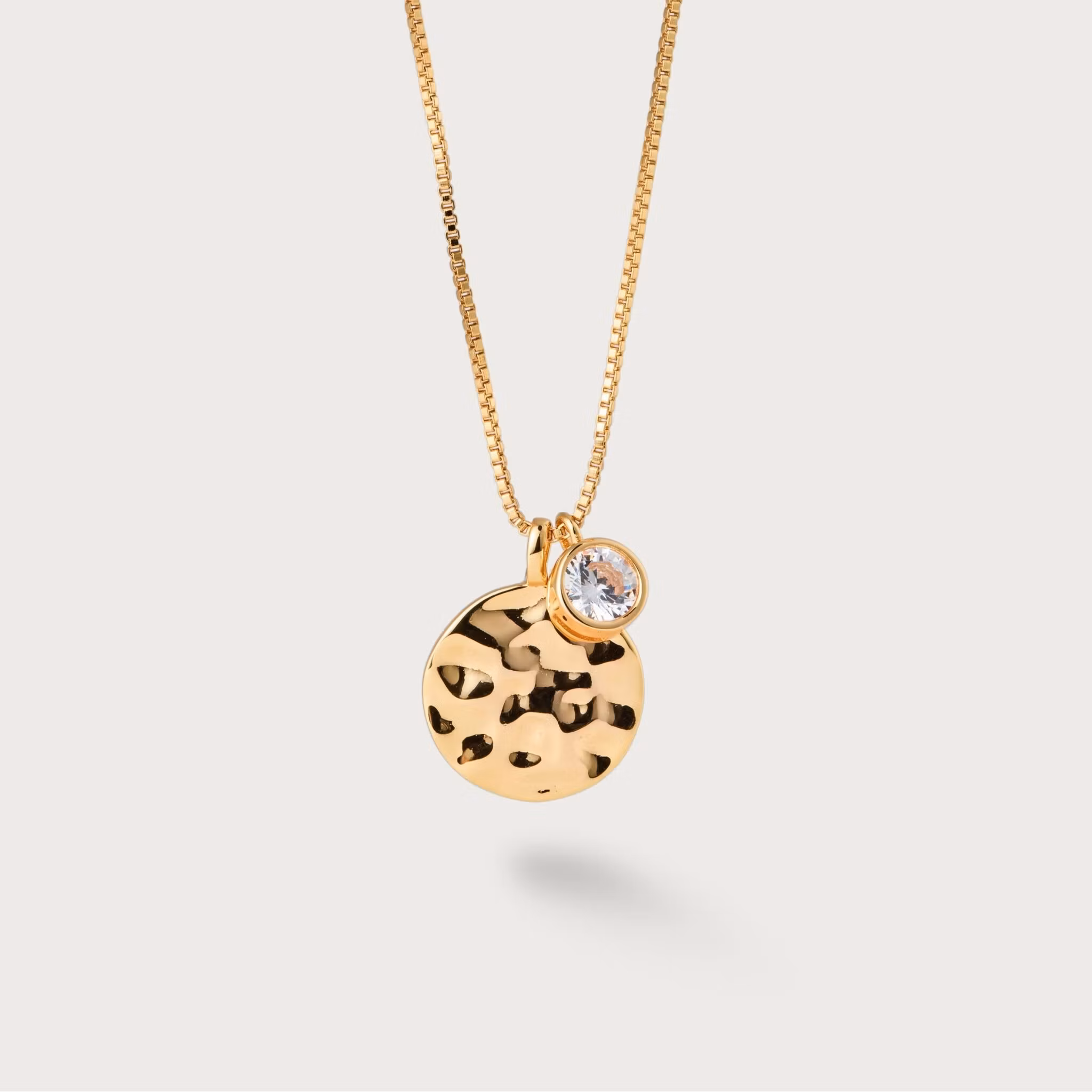 Fra morgenkaffe til sene middage. En halskæde med det ekstra der følger dig hele dagen. Designet med vedhæng og hamret overflade.
