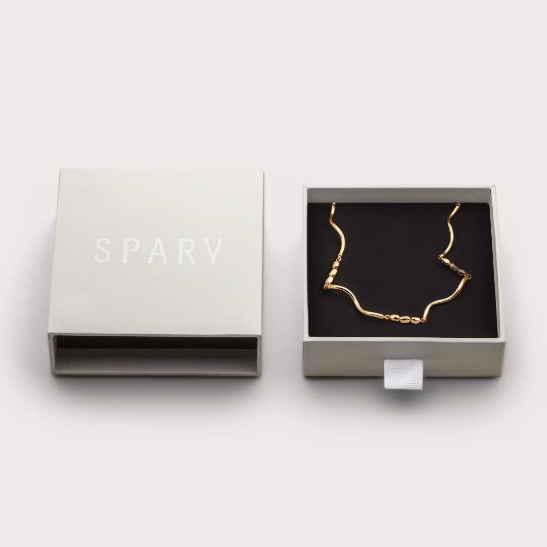Soft Wave kommer i to udførelser: forgyldt (18K) og sølvbelagt messing. Alle smykker er nikkelfri, og vores guldbelagte smykker har en ekstra tyk forgyldning af 18K, der er lavet til at holde i lang tid. Omhyggeligt pakket i æsker af genbrugspapir og FSC-mærket papir.