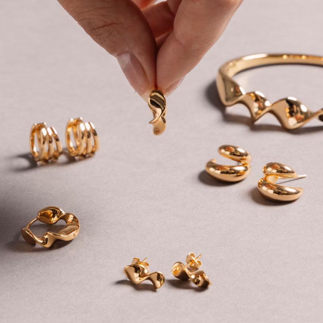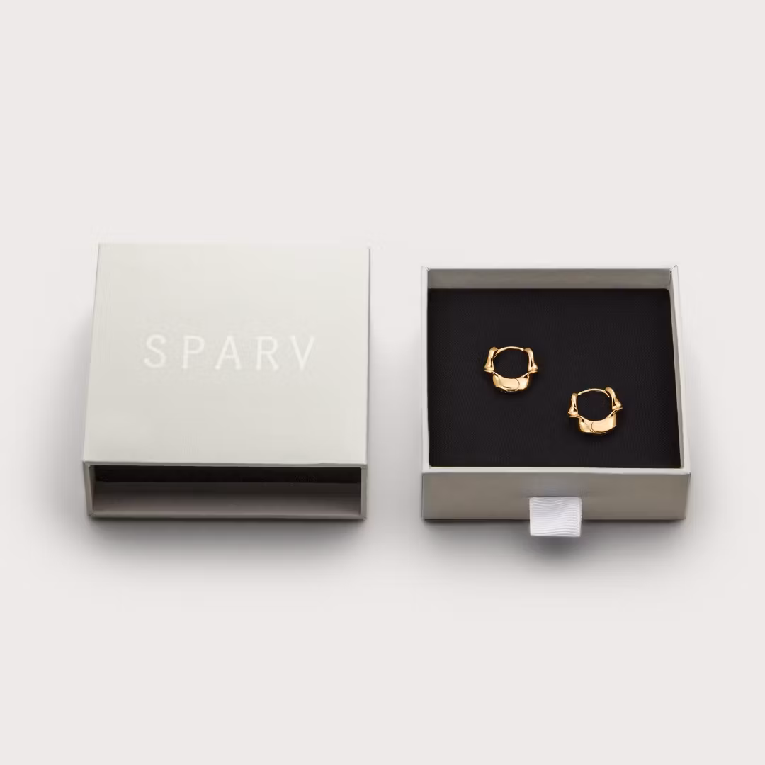 Day One sælges i par og kommer i to udførelser: forgyldt (18K) og sølvbelagt messing. Alle smykker er nikkelfri, og vores guldbelagte smykker har en ekstra tyk forgyldning af 18K, der er lavet til at holde i lang tid. Omhyggeligt pakket i æsker af genbrugspapir og FSC-mærket papir.