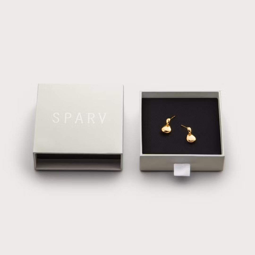 Melted sælges i par og kommer i to udførelser: forgyldt (18K) og sølvbelagt messing. Alle smykker er nikkelfri, og vores guldbelagte smykker har en ekstra tyk forgyldning af 18K, der er lavet til at holde i lang tid. Omhyggeligt pakket i æsker af genbrugspapir og FSC-mærket papir.